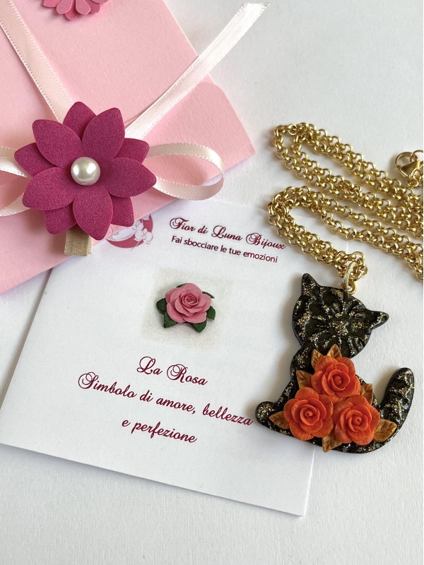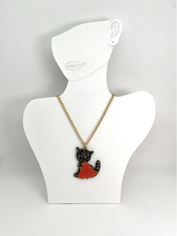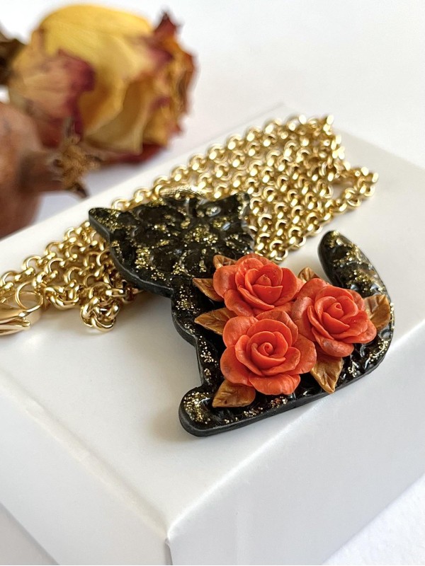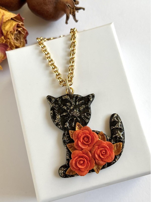 Rose arancioni con foglie, gatto nero con glitter dorati e collana dorata