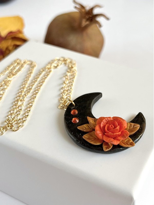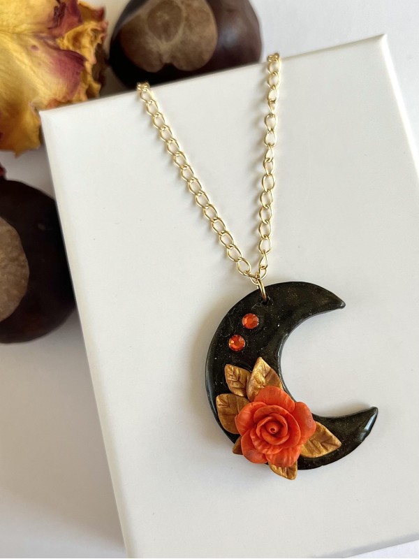Rose arancioni con foglie dorate, luna nera con glitter e collana dorata