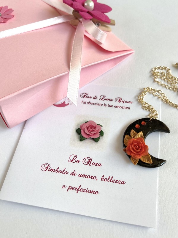 Ogni fiore è realizzato in pasta polimerica ed è creato a mano, petalo per petalo, così come le foglie sono modellate una ad una. Ogni singola miniatura viene poi assemblata per dare vita a ciondoli esclusivi da cui nascono i gioielli Fior di Luna.