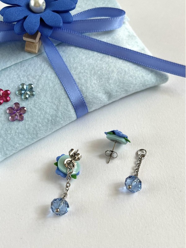 Il fiore al lobo misura circa 1,3x1,3 cm e la lunghezza totale dell’orecchino con i cristalli pendenti è di circa 3 cm