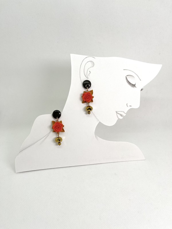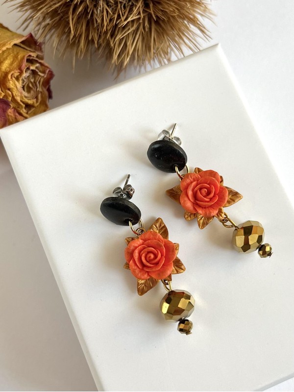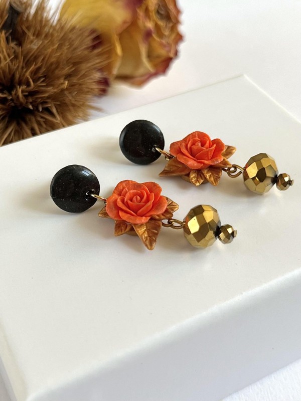 Rosa arancione con foglie dorate, perni neri con glitter, cristalli dorati